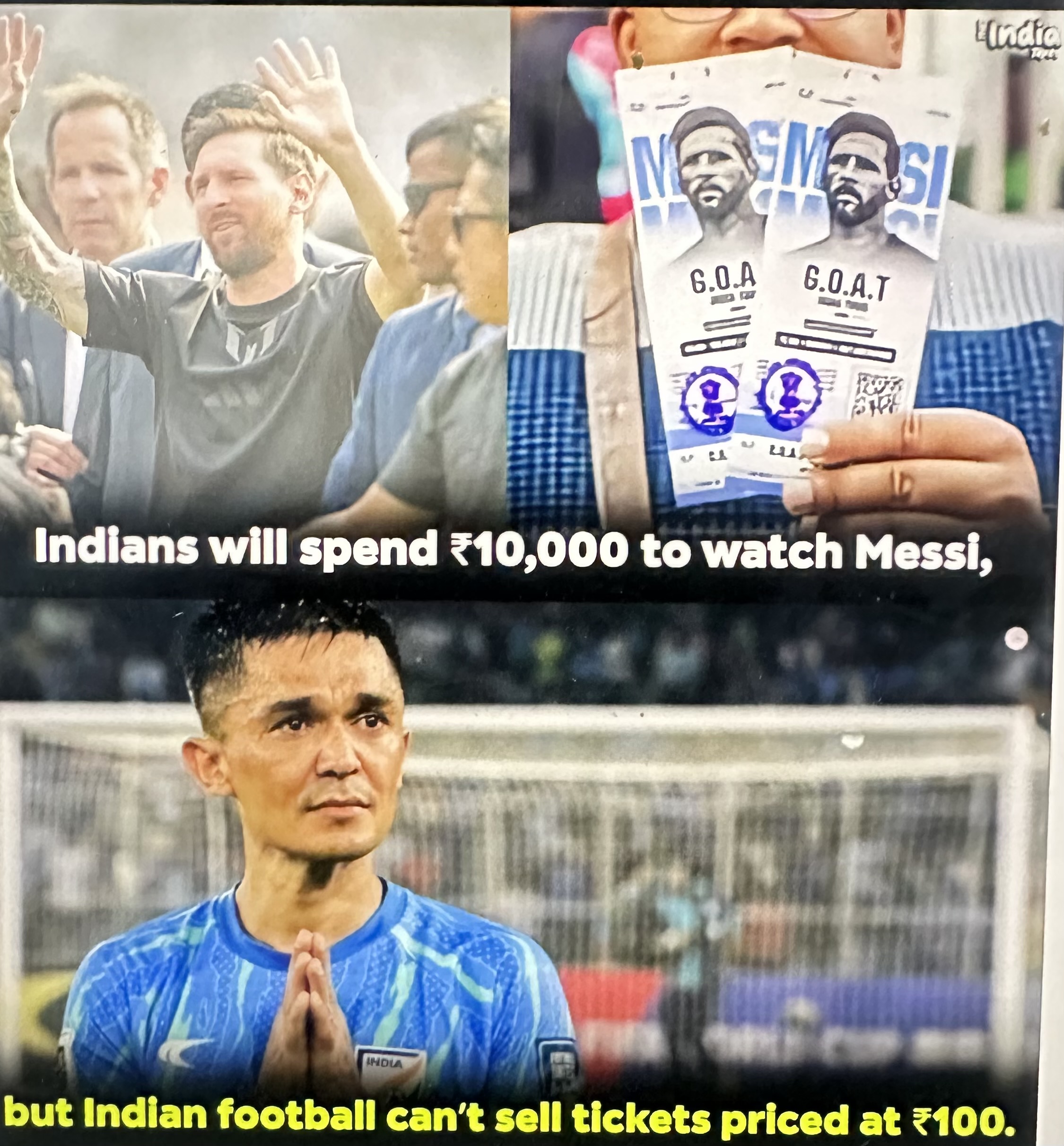 आम जनता सिर्फ जयकारे लगाकर खुश हो जाती है और इनकी टिकिट खरीदकर। कोलकाता में दर्शकों ने नेताओं को बता दिया कि आक्रोश क्या होता है वहीँ मुंबई में सचिन तेंदुलकर को मेस्सी के सामने ये जतवा दिया कि हमारे लिए महान भारत में भी है, मेस्सी स्वयं परेशान है ये देखकर कि कैसे लोगों के बीच आ गया. कल इनसे दो नेताओं ने हैदराबाद में मुलाकात की और एक तो पतली टांगो के साथ फ़ुटबाल खेलते दिखा.खैर मीडिया मसाला लगा रहा, कुछ लोग मुगालते में भी थे लेकिन देश में १०० रूपये फुटबाल पर खर्च न करने वाली मानसिकता, मेसी पर १२००० खर्च कर गई.. दोहरे लोग दोहरी मानसिकता.